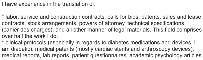 Me alegra mucho que estos traductores hagan traducciones médicas, técnicas y un largo etcétera, pero ¿cómo creen que especificar toda esa información les convertirá en el candidato ideal para una traducción de poemas? No solo no supone valor añadido, sino que resta.